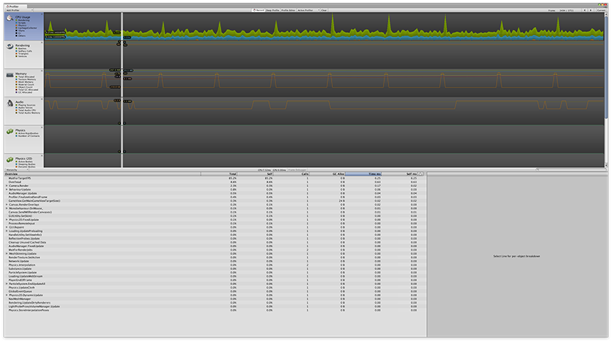 프로파일러 창의 왼쪽 열(column)에 프로파일러가 종류별로 있습니다. 각 프로파일러는 게임의 특정 부분에 대한 정보를 보여주고 있습니다. CPU 사용, GPU 사용, 렌더링, 메모리 사용, 오디오, 물리, 네트웍과 같은 프로파일러들로 구분되어 있죠.
