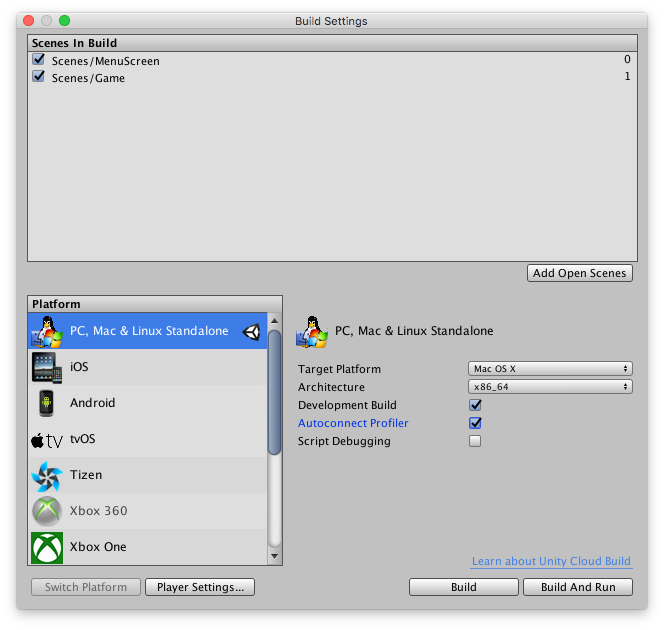 우리의 게임을 프로파일하는 방법은 2가지가 있습니다 : 첫번째는 유니티 에디터 상에서 프로파일링하는 방법이고, 두번째는개발 빌드(development build)를 해서 유니티 에디터 밖에서 실행시키는 방법입니다. 개발 빌드는 일반적인 빌드와는 두가지 측면에서 다릅니다 : 첫번째는 개발 빌드는 게임이 실행될 때 프로파일러 창에 연결할 수 있다는 것이고, 두번째는 개발 빌드에 디버깅을 가능하게 하는 파일들이 포함된다는 것입니다.
