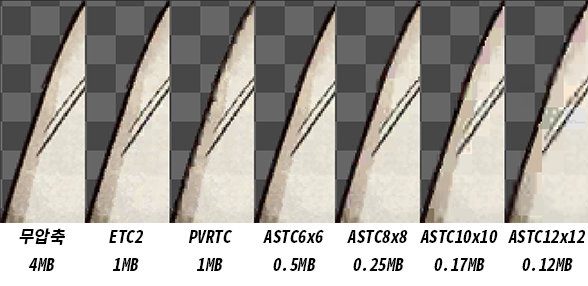 특히나 PVRTC는 iOS의 기본 포맷인데도 ETC2에 비해 심하게 뭉개지는 것을 확인할 수 있다.