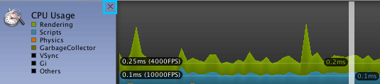 프로파일러 창에서 데이터를 기록하는데에 약간의 비용이 든다는 것을 이해하는 것은 중요합니다. 이는 모든 프로파일링 툴에서 공통적인 부분입니다; 이러한 약간의 오버헤드없이 데이터를 기록하고 표시하는 것은 불가능한 일입니다. 이는 게임이 동작하는데에 있어서 중대한 변화를 초래하지는 않지만, 프로파일러 창이 기록을 하는동안 아주 약간의 성능에 영향을 미칠 수는 있습니다.