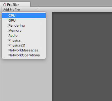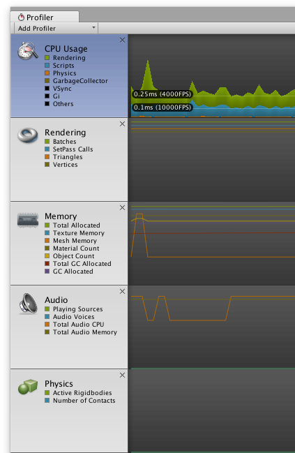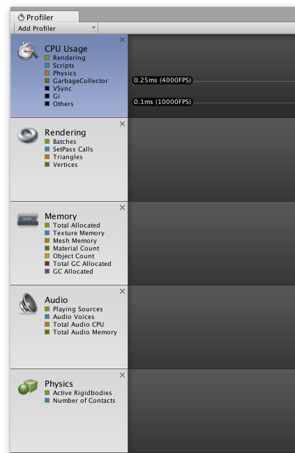 프로파일러 창의 왼쪽 열(column)에 프로파일러가 종류별로 있습니다. 각 프로파일러는 게임의 특정 부분에 대한 정보를 보여주고 있습니다. CPU 사용, GPU 사용, 렌더링, 메모리 사용, 오디오, 물리, 네트웍과 같은 프로파일러들로 구분되어 있죠.