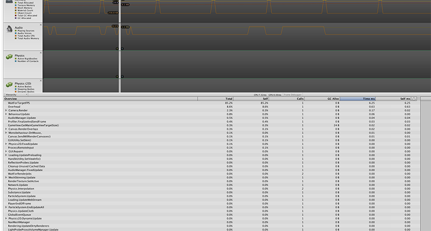 프로파일러 창을 사용해서, 게임에서 메모리가 어떻게 사용되는지, 다른 작업들을 진행하는데에 얼마나 많은 CPU 시간이 소비되는지, 그리고 물리 계산이 얼마나 자주 이뤄지는지 등과 같이 게임 성능과 관련된 여러가지 면을 배울 수 있습니다. 가장 중요하게는, 이 데이터가 우리의 게임에서의 성능 문제에 대한 원인을 찾고, 그러한 문제를 해결하는 시도가 얼마나 영향을 미칠 수 있는지 측정하는데에 도움이 되도록 사용할 수 있다는 것입니다.