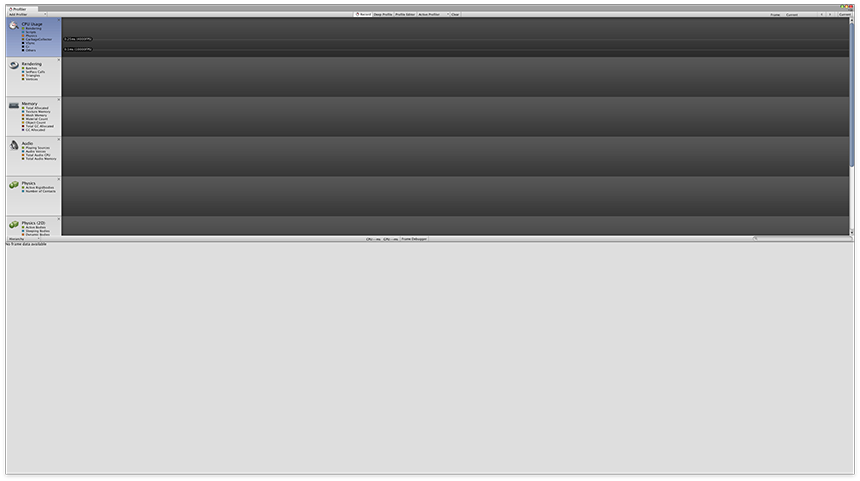 프로파일링 데이터가 기록되어야만 프로파일러 창에서 정보를 볼 수 있음을 꼭 기억하십시오. 우리가 처음 프로파일러 창을 열면, 실행 중인 게임으로부터 프로파일링 데이터를 기록하기 전까지는 특정 영역은 비어있습니다.