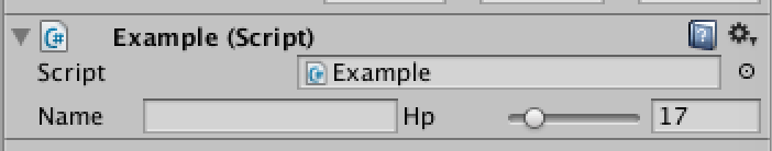 왼쪽은 유니티가 자동으로 IntField라고 판단했을 경우이고, 오른쪽은 PropertyDrawer로 Slider를 지정한 경우입니다. 예를들어 다음과 같이 Serialize 가능한 클래스가 있다고 합시다.